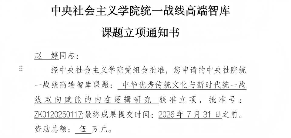 近期,中央社会主义学院公布了统一战线高端智库2025年度项目立项评审结果,我院赵婷博士申报的《中华优秀传统文化与新时代统一战线双向赋能的内在逻辑研究》获得立项。