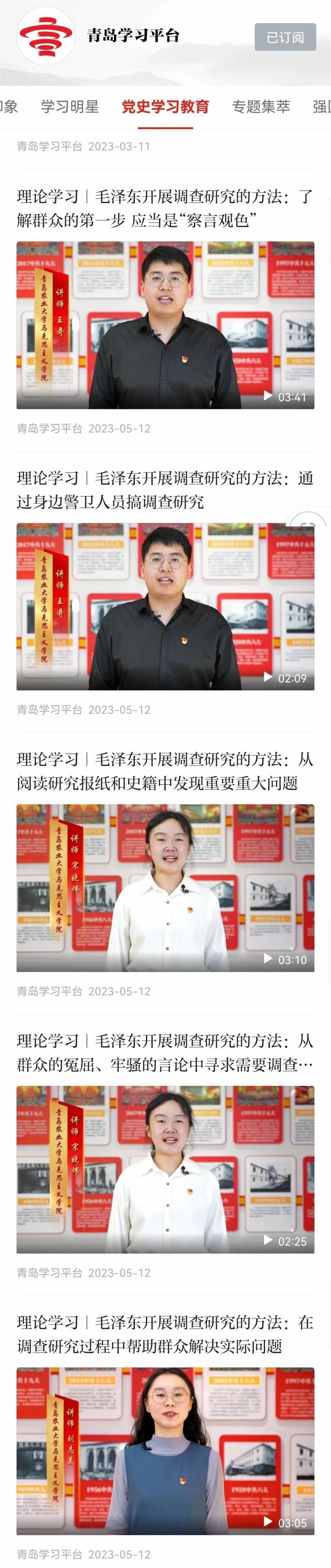 5月12日,太阳成集团tyc9728教师宋晓炜、王奇、刘志美录制的微视频“毛泽东开展调查研究的五种方法”登上学习强国青岛学习平台。微视频由城阳区党委宣传部组织录制,三位老师围绕毛泽东开展调查研究的五种方法“了解群众的第一步应当是‘察言观色’”“通过身边警卫人员搞调查研究”“从阅读研究报纸和史籍中发现重要重大问题”“从群众的冤屈牢骚的言论中寻求需要调查研究的问题”“在调查研究过程中帮助群众解决实际问题”共录制5个视频,以饱满的情感通俗易懂地阐述了毛泽东开展调查研究的思路方法。