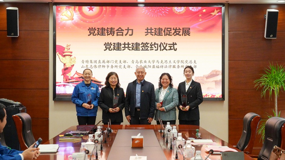 学院党总支书记修彩波、青特集团有限公司直属部门支部委员会书记纪国清、山东志伟律师事务所党支部书记王雅正及青岛城阳盈福祥法律服务所党支部书记姜蓝英出席签约仪式,并签订了合作共建协议。青岛市城阳区法律服务行业党委书记王宪成为共建单位颁发共建纪念杯。