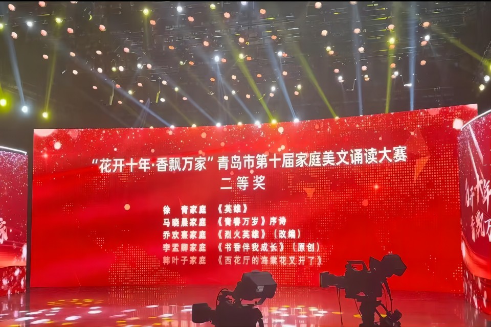 10月15日至16日,由青岛市妇联、市文明办、市文旅局联合主办,青岛市妇女儿童活动中心承办的“花开十年 香飘万家”——青岛市第十届家庭美文诵读大赛决赛在青岛市广播电视台800平米演播大厅进行。我院教师韩叶子家庭荣获二等奖。