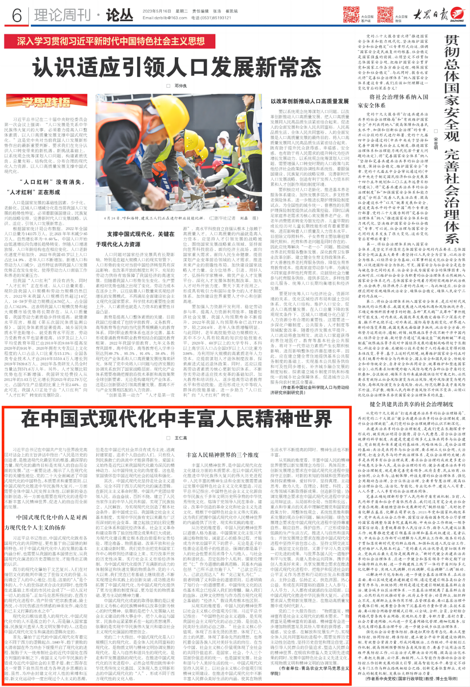 习近平总书记在中国共产党与世界政党高层对话会上的主旨讲话中指出:“人民是历史的创造者,是推进现代化最坚实的根基、最深厚的力量。现代化的最终目标是实现人的自由而全面的发展。”这一重要论述,揭示了人在现代化中的关键性地位。党的二十大全面阐述了中国式现代化的中国特色、本质要求和重要原则。以中国式现代化推进中华民族伟大复兴,一方面需要全体中国人民发挥主体性,以崭新的姿态创新创造,另一方面也需要在现代化的进程中不断丰富人民精神世界,促进人的自由而全面的发展。